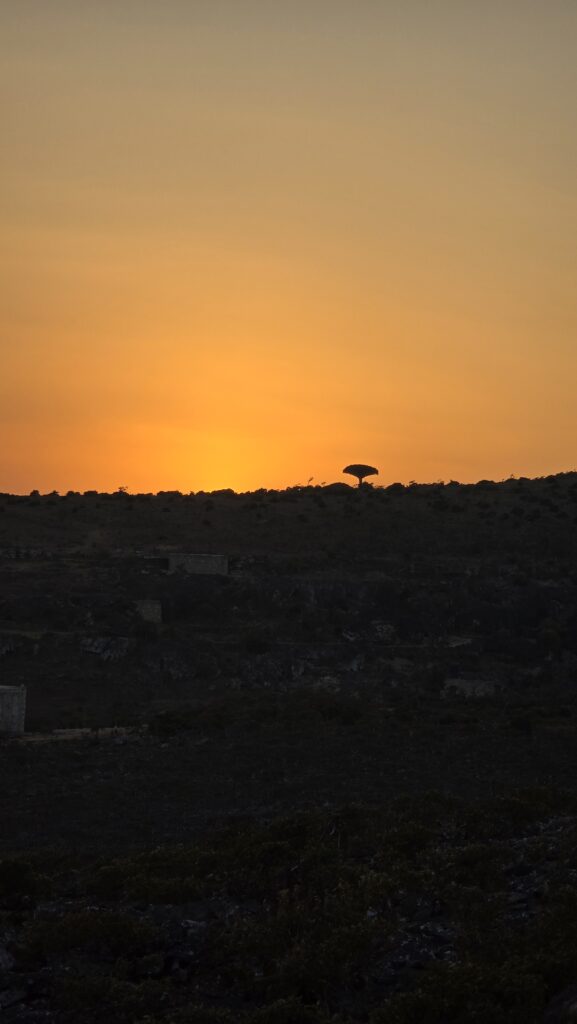 Between the burning edge of a rare sunset and the silent bloom of galaxies above, even the Dragon’s Blood Tree stands like a witness to eternity. Here, earth and cosmos are not separate—they are one breath, one silence, one endless story.